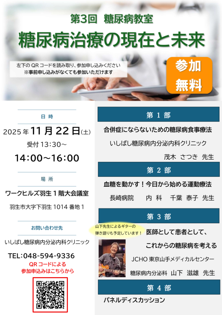 - 第3回糖尿病教室を開催します!11月14日は、世界糖尿病デーです。 糖尿病治療への理解を深めるために、当院は毎年11月に糖尿病教室を開催しています。 今年は11月22日(土)に開催します。 事前参加予約できます。 ご希望の方は、下記のURLよりお申し […]